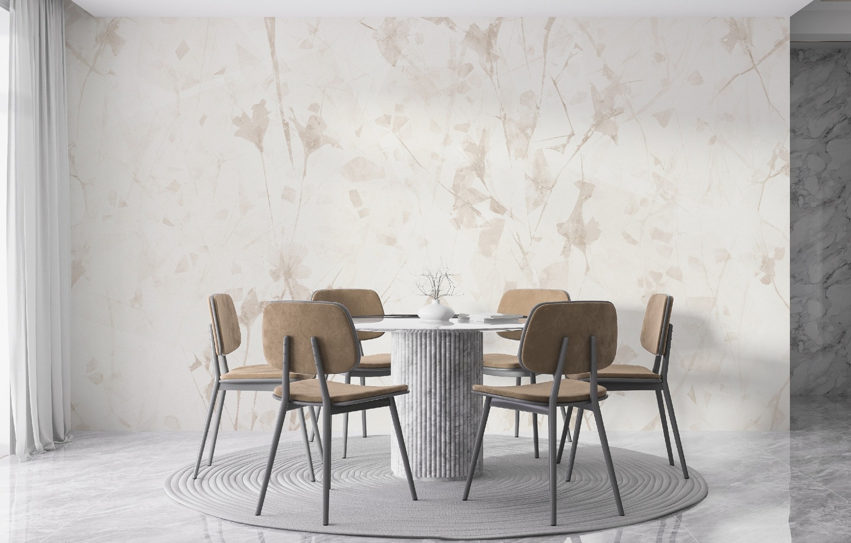Vinyl wallcovering with a non-woven backing. Weight ca. 400 g/m2. Surface with AntiScratch component. Certificates: fire retardancy B s1, d0, PZH, FSC mix. Max panel width - 98 cm Recomended for light coloured designs to fully appreciate the texture. Cools down the colors and streghtens contrast.